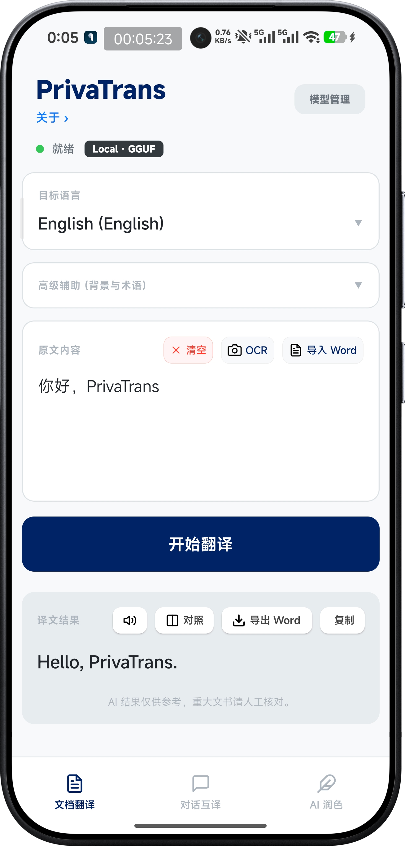 No user data is ever uploaded to PrivaTrans servers. You control the model, you control the data.